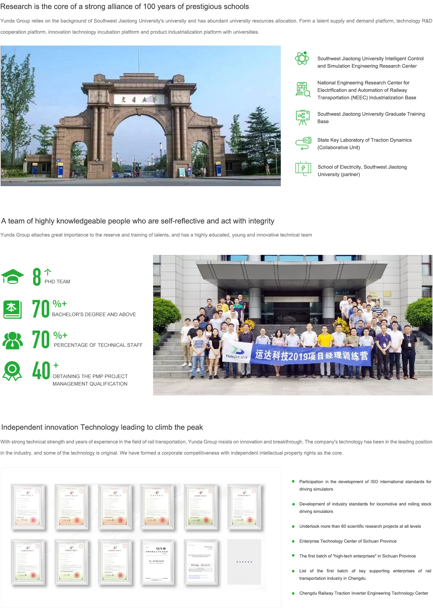 Chengdu Yunda Technology Co., Ltd. (hereinafter referred to as "Yunda Technology") originated from a school-run enterprise of Southwest Jiaotong University founded in 1992 and listed on Shenzhen Stock Exchange in April 2015 (stock code: 300440).Adhering to the mission of "making transportation safer and more convenient", the company is committed to providing intelligent solutions and services for rail transportation business. It is one of the few leading high-tech enterprises with core independent intellectual property rights and production capacity in China.At present, the company has about 1,000 employees and its business covers more than 10 countries and regions.